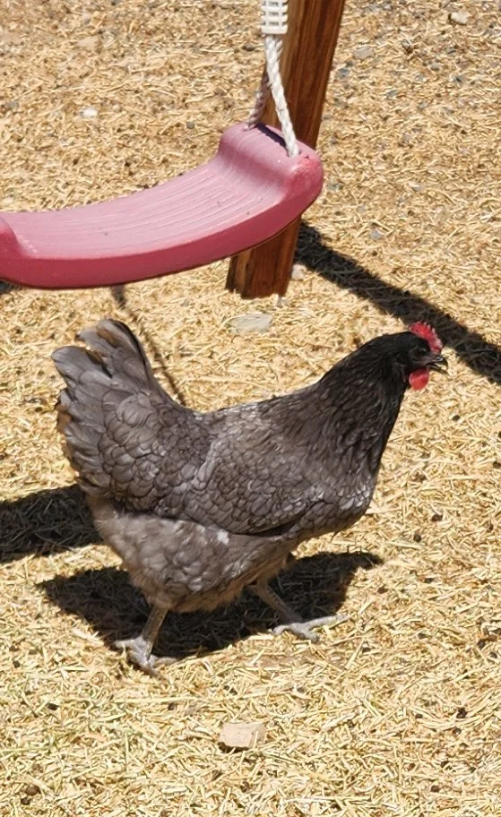 Our Chickens are treated like any other beloved pet on the farm. They free range with the goats and are fond of treats and special attention. Roosters are at the top, hens below them. Chicks will have their photos added once all their feathers grow in.